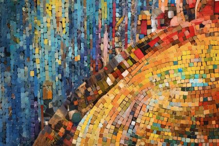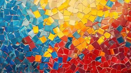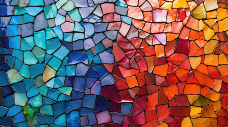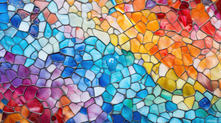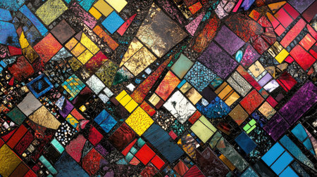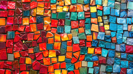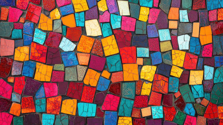 A captivating close-up shot of a vibrant mosaic wall, showcasing a stunning blend of textures and colors. Perfect for artistic and interior design projects.