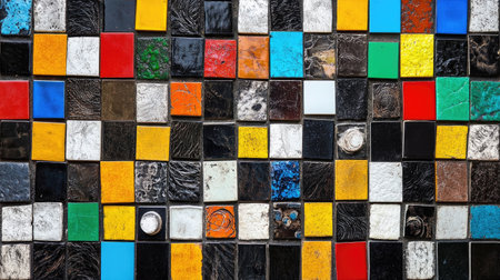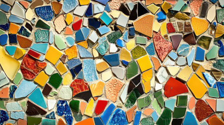 A vibrant mosaic wall showcasing a variety of colorful tiles. The intricate pattern and textures create a dynamic visual experience, perfect for artistic backgrounds.