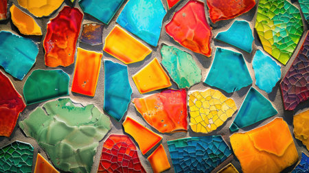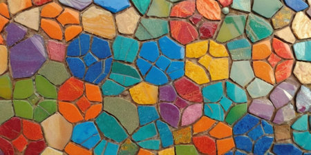 Textured surface featuring colorful fragments of stone and ceramic, arranged in mosaic pattern. vibrant colors include orange, yellow, red, and green, creating lively and artistic appearance
