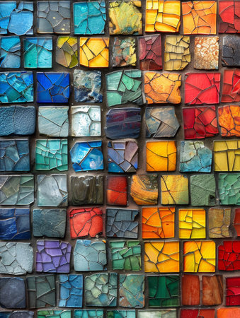 A vibrant and colorful mosaic pattern showcasing an artistic arrangement of various tiles in bright hues. Perfect for backgrounds and decorative elements.