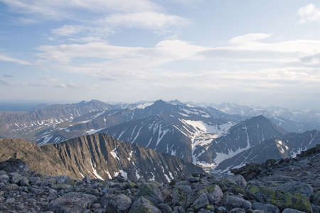 Beautiful natural landscape in the mountains of Siberia, Russia. Sunlight illuminates the rock with the snow