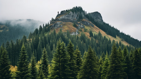 Experience the calm allure of a mountain slope adorned with evergreen trees under a soft cloudy sky, showcasing the tranquil beauty of untouched nature.