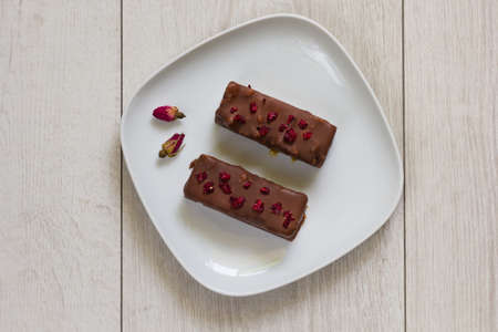 Top view of two chocolates with dry cherry topping on white plate on white background