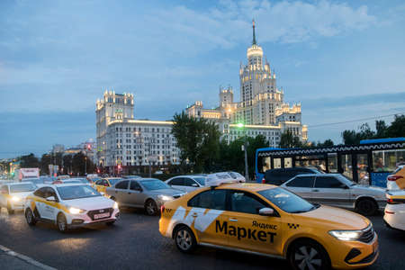 MOSCOW, RUSSIA - September 12, 2021: View of the Stalinist skyscraper on Kotelnicheskaya embankment in the evening at rush hour.