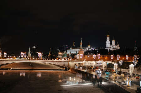 View of Moscow Kremlin and Bolshoy Kamenny Bridge from Patriarshy Bridge at night in winter in Moscow. Russia