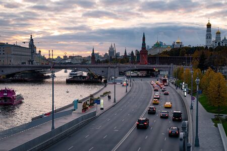 Moscow, Russia - October 08, 2019: View of Moskvoretskaya Embankment of Moskva River in sunny autumn day. Traffic during rush hour in Moscow center