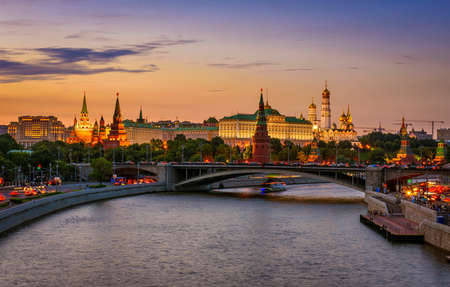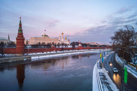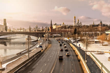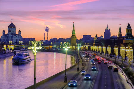 Moscow - 16 February 2019: Colorful evening landscape with view on kremlin embankment and moscow river.