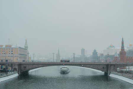A motor vessel sails under the Bolshoi Moskvoretsky Bridge near the Moscow Kremlin