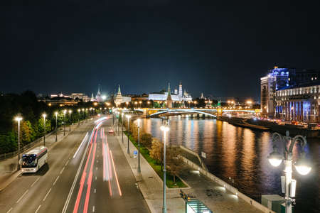 MOSCOW, RUSSIA - AUGUST, 2019: Moscow Kremlin and bridge through Moscow River at night