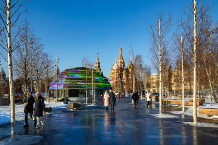 RUSSIA, MOSCOW, DECEMBER, 2021 - Zaryadye Park with modern architecture against the backdrop of St. Basils Cathedral on Red Square - is a tourist attraction of Moscow city.