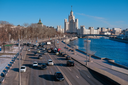 City view of the Moskva River in winter.House on Kotelnicheskaya embankment.Tourism in Russia.