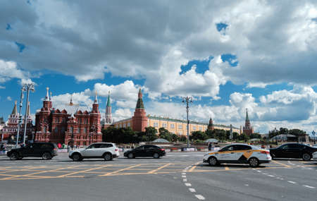 Moscow, Russia - 23 Jul 2020: General landscape view at tradition Moscow architecture. City life on the central streets of the city. The citizens go on their own business. Automobile traffic.