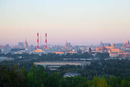 view of central Moscow from Sparrow Hills or Vorobyovy Gory observation (viewing) platform at sunset-- is on a steep bank 85 m above the Moskva river, or 200 m above sea level. Russia