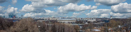 April 20, 2022- Moscow, Russia: Panorama of Moscow from the Sparrow Hills. View of the Moscow City, the Moscow River, the Luzhniki Sports Complex