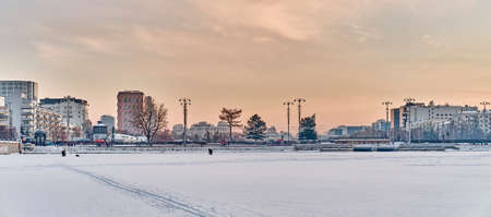 View of sights of downtown of Yekaterinburg, Russia, from ice of city pond, covered with snow.