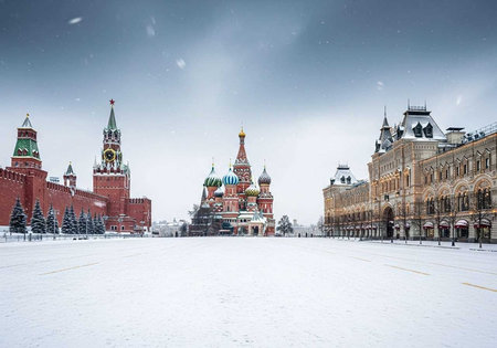 A snowy Red Square in Moscow with historic buildings and churches under a gray sky