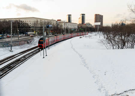 Electric locomotive Moscow central railway circle diameter - MCD, rzd Russia railway roads. Against the background of skyscrapers Moscow city, business center. Russia, Moscow, 06 march 2021