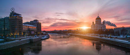 MOSCOW, RUSSIA - JANUARY 1, 2010: Estryady theatre view at winter and Cathedral of Christ the Saviour sunset panoramic view