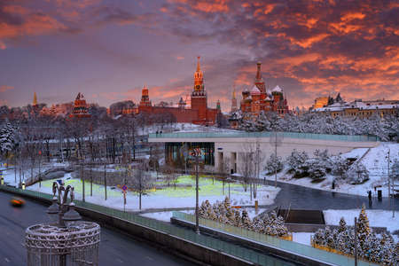 View of the Moscow Kremlin and St. Basils Cathedral from Zaryadye Park