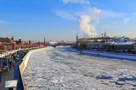 Moscow, Russia - February 01, 2018: Moskva river near Moscow Kremlin on a sunny winter day. Moscow in winter