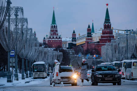 MOSCOW, RUSSIA - JANUARY 21, 2019: The girl crosses the road at a pedestrian crossing under the Patriarchal Bridge.