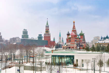 Moscow, Russia - February 8, 2020: View of the Moscow Kremlin, Spasskaya tower and St. Basil's Cathedral from Zaryadye Park on sunny winter day.