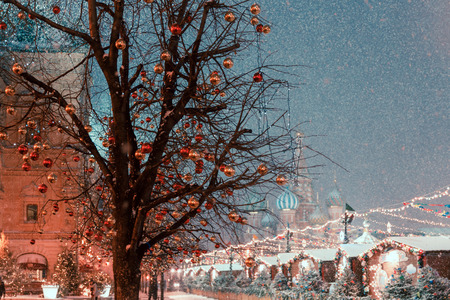 Christmas decorations on Christmas trees, streets of winter Moscow, Christmas markets and festivals in snow