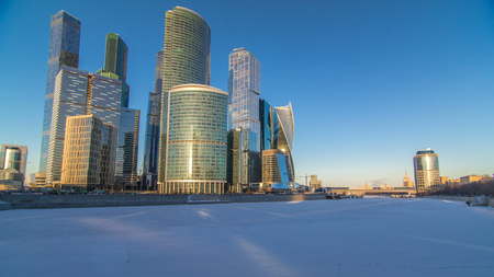 Moscow City in winter at sunset timelapse. International business center with reflection from the sun on frozen river and a commercial district in central Moscow, Russia.