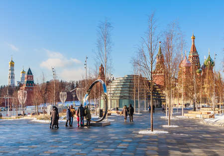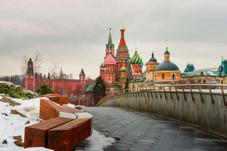 Moscow. Russia. March 15, 2018. View of the Moscow Kremlin and St. Basil's Cathedral on Red Square. View from the Zaryadye park