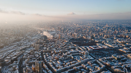 Panoramic aerial view of winter city Kyiv covered in snow