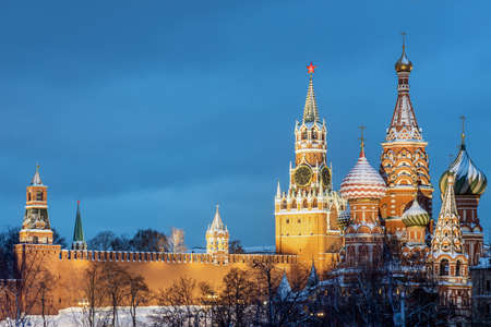 Dusk view of St. Basils Cathedral in winter, Red Square, Moscow, Russia