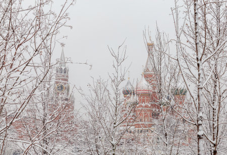 Beautiful winter cityscape with the view from Zaryadye park on the covered snow Spasskaya Tower (Savior’s Tower) of Moscow Kremlin and St. Basil’s Cathedral framed by white trees.