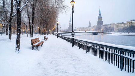 view of Moscow city, embankment Moscow river under the ice in winter, snow, flock of birds