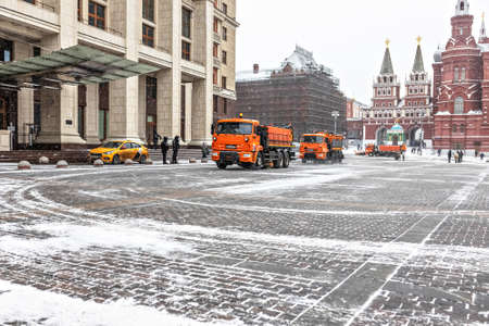 View of Manezhnaya Square and the Russian Historical Museum. Snowfall and cyclone in the city. Snowblowers are working on the square. The municipal services of the city are working