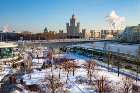 Moscow, Russia - February 01, 2018: Views of Moskva river from the Patriarshiy Bridge at sunny winter morning