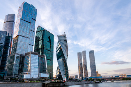 Moscow, Russia - July 22, 2023: Buildings of the Moscow City business center in the cityscape.