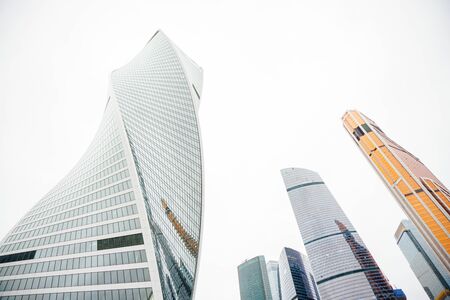 Down-up view at skyscrapers in Moscow-city (Moscow International Business Center), Russia. Modern architecture.
