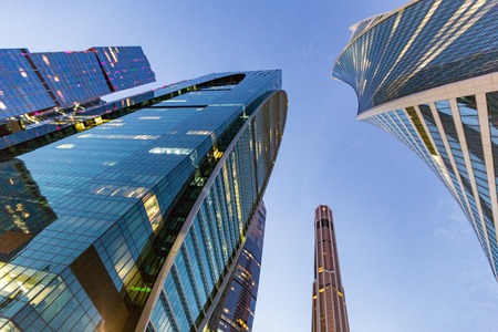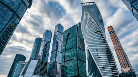 Moscow, Russia - October 17, 2018: Down-up view at skyscrapers in Moscow-city (Moscow International Business Center), Russia. Modern architecture.