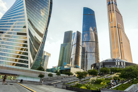 Moscow, Russia - June 18, 2018: Low angle view of the buildings Moscow-city International Business Centre and afimall city. Area of modern skyscrapers.