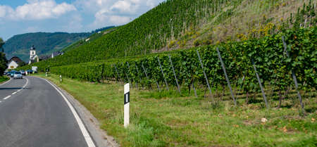 Driving car on famous green terraced vineyards in Mosel river valley, Germany, production of quality red and white, riesling