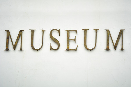 Medium shot of a museum facade featuring detailed architectural elements with the main entrance sign in sharp focus under bright daylight.