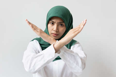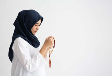Asian muslim woman wearing prayer beads welcoming guests or Ied Fitr Greeting in white background