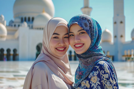 two muslim beautiful woman wears hijab smiling to camera in front of mosque