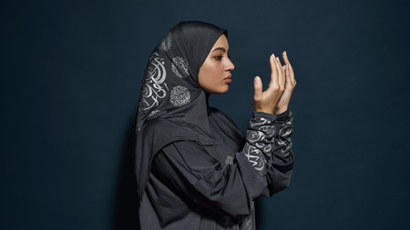 portrait of african muslim woman wearing hijab and traditional muslim clothes posing in front of purple background