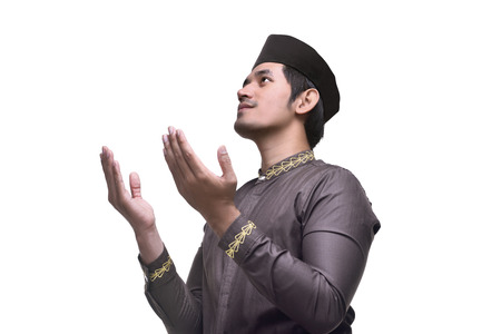 Young Muslim Guy Making Traditional Prayer To God While Wearing A Traditional Cap Dishdasha