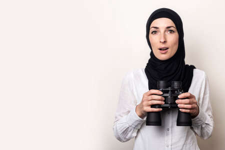 Friendly surprised Young Muslim woman in white shirt and hijab holds binoculars. Banner.