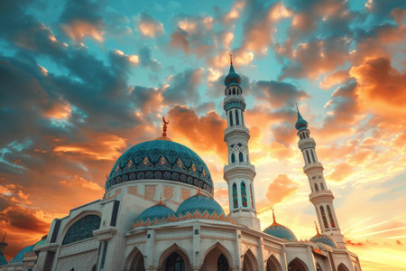 The stunning and peaceful majestic mosque at sunset with intricate minarets and beautiful islamic architecture, set against a vibrant sky with clouds, creating a picturesque silhouette