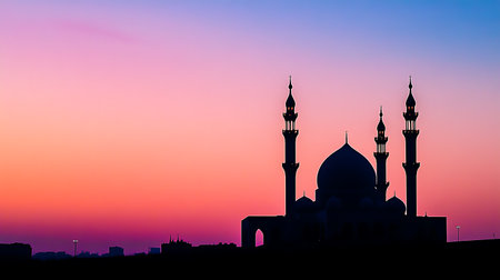 Silhouette of mosque at sunset. Ramadan Kareem background.