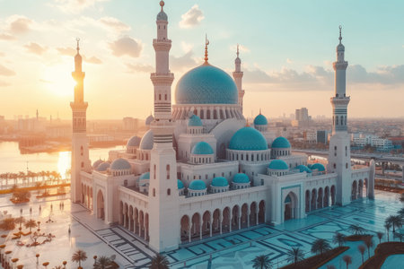 Stunning mosque stands tall against a vibrant sunset, with crescent moon above and cityscape in the background, highlighting architectural elegance and cultural richness