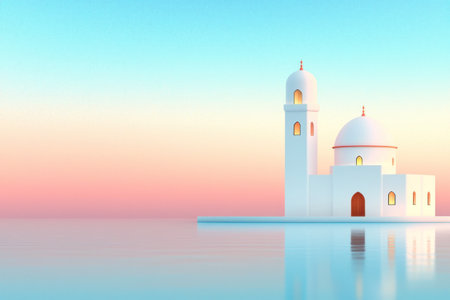 Minimalist mosque illustration with serene colors and reflections.